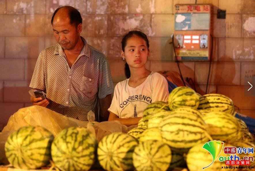 2016年7月10日夜晚,在河南省洛陽市老城街頭,宜陽縣高村鄉(xiāng)仟佰嶺村47歲的瓜農(nóng)石勛帶著12歲的女兒賣西瓜。“現(xiàn)在帶女兒賣瓜讓她體驗(yàn)一下瓜農(nóng)的艱辛是為了長(zhǎng)大女兒不再賣瓜,我家種了四畝西瓜,從家里到洛陽開拖拉機(jī)要跑六個(gè)小時(shí),賣完西瓜回家趕,每天只能休息三個(gè)小時(shí),女兒去最遠(yuǎn)的地方就是洛陽城,一車西瓜賣完給女兒20塊零花錢,女兒很開心”。石勛說。