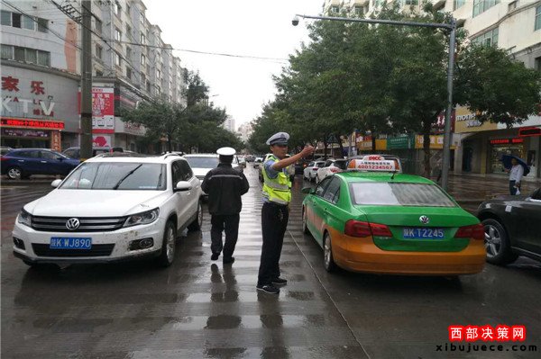 但是,受雨天影響,城區(qū)部分路段不同程度受阻淤積,路面濕滑,能見度低,交通安全隱患突出,給廣大人民群眾出行帶來不便,為確保道路交通安全穩(wěn)定,靖邊縣公安局交警大隊城區(qū)二中隊領導高度重視,及時掌控路面情況,啟動雨天應急預案,落實各項有效管控措施,嚴防雨天道路交通事故發(fā)生。