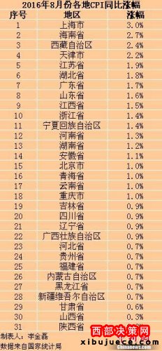 在31個省份中,上海8月份CPI漲幅全國最高,為3.0%,漲幅比7月回落0.4個百分點(diǎn)。數(shù)據(jù)顯示,上海CPI漲幅自今年3月份開始已連續(xù)6個月處于“3時代”。陜西和山西8月份CPI漲幅僅為0.3%,為全國最低。