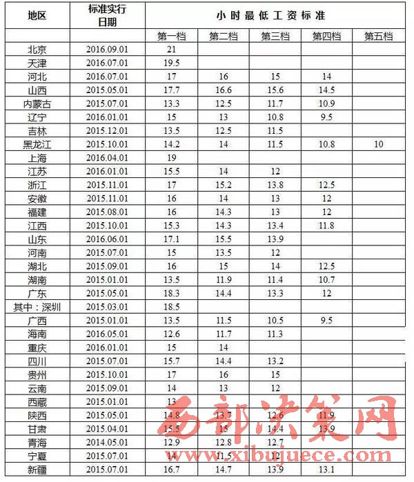 同一天,人社部勞動關(guān)系司公布的《全國各地區(qū)小時最低工資標準情況》則顯示,小時最低工資標準中,北京最高,為21元,其次是天津,為19.5元。