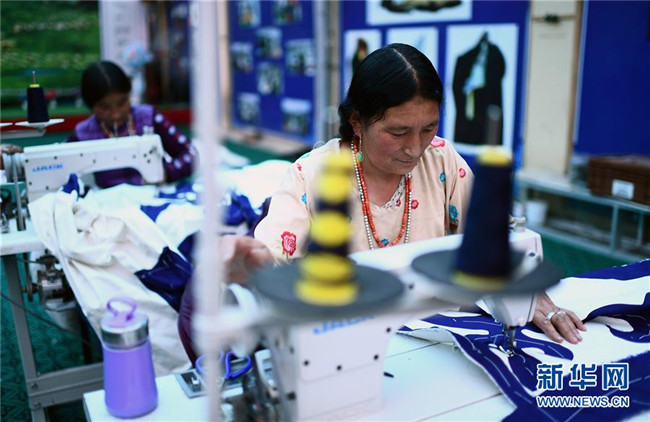 6月13日,在河南蒙古族自治縣那日宗畜牧業(yè)牧民專業(yè)合作社民族服裝加工廠,荷日恒村牧民才讓卓瑪在制作帳篷。新華社記者 張宏祥 攝