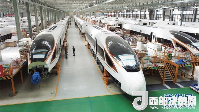 在位于吉林長(zhǎng)春的中車(chē)長(zhǎng)客股份公司高速動(dòng)車(chē)組裝配車(chē)間里,幾列“復(fù)興號(hào)”中國(guó)標(biāo)準(zhǔn)動(dòng)車(chē)組在進(jìn)行裝配(2017年9月14日攝)。新華社記者張楠攝