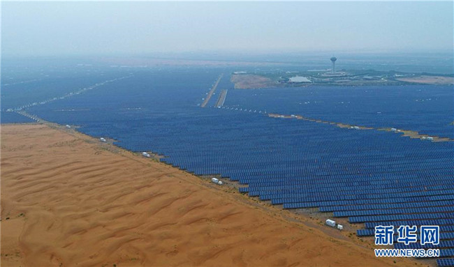 寧夏中衛(wèi)市沙漠光伏產(chǎn)業(yè)園光伏電站(9月7日無人機拍攝)。新華社記者王鵬攝