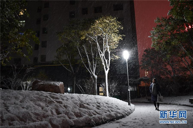 在青海省西寧市一小區(qū)內(nèi),一名市民在院內(nèi)前行(11月3日攝)。 11月3日,青海省西寧市等地迎來降雪。 新華社記者 吳剛 攝