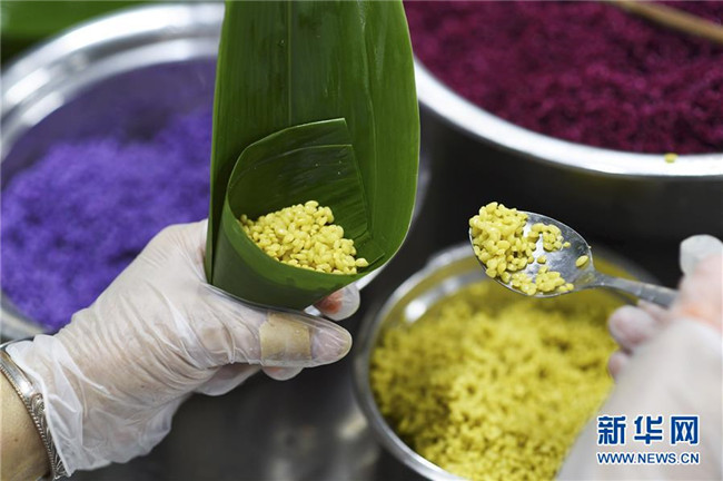 6月2日,在臺(tái)江縣一家食品生產(chǎn)企業(yè)車間,工人在包制五彩粽?!⌒氯A社發(fā)(劉開(kāi)福 攝)