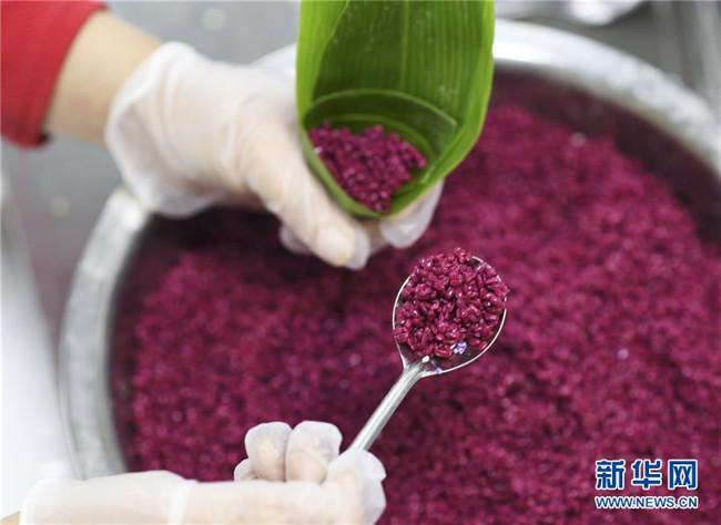 端午節(jié)將至,貴州省黔東南苗族侗族自治州臺(tái)江縣粽子加工企業(yè)加緊制作具有當(dāng)?shù)靥厣奈宀属占案魇紧兆?,滿足市場(chǎng)需求。