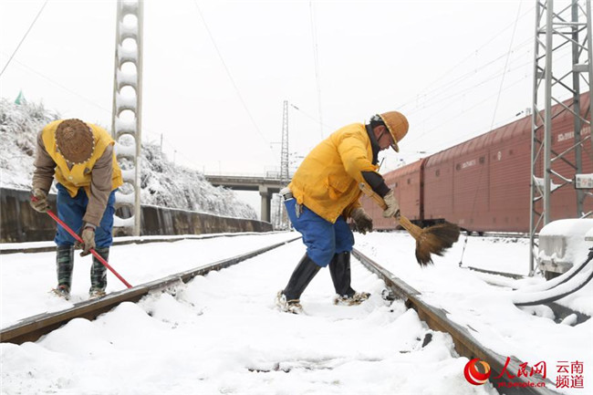 12月5日,云南省滇東北迎來今年以來首場降雪。昆鐵曲靖工務段及時啟動大雪天氣應急預案,成立除雪打冰隊,加強道岔除雪除冰工作。攝影:楊永全