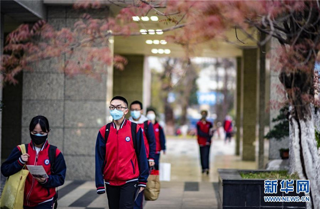 3月23日,昆明市第一中學(xué)高三年級(jí)的學(xué)生進(jìn)入校園準(zhǔn)備上課。新華社記者 江文耀 攝