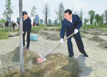 四月八日,四川省委書記彭清華到成都市調(diào)研公園城市建設(shè)推進(jìn)情況。在天府中央公園,彭清華與天府新區(qū)干部群眾一起植樹造林,為公園城市建設(shè)再添一抹綠、貢獻(xiàn)一份力。記者 歐陽(yáng)杰 攝
