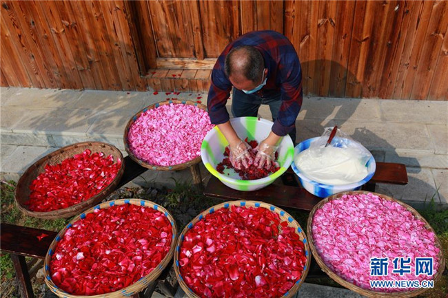 5月14日,在貴州省畢節(jié)市百里杜鵑戛木管理區(qū)中塘村鮮花基地,村民加工鮮花糖。新華社發(fā)(周燕林 攝)