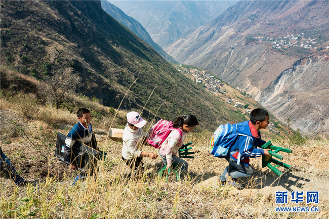 李本艷姐弟倆從家門口沿著崎嶇的山路走到學校,要近兩個小時,每走一步,腳下都是數(shù)百米高的懸崖。搬家后,姐弟倆帶著書包和小板凳離開(攝于4月1日)。新華網(wǎng)發(fā)(鮑禹 攝)