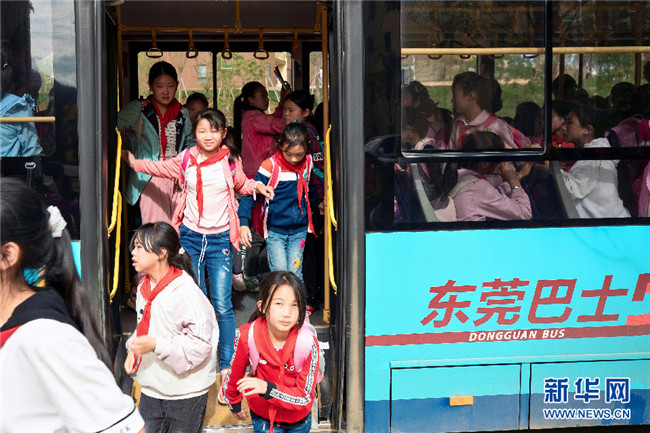 如今,李本艷姐弟倆從卯家灣家門口坐上東莞愛心巴士,25分鐘就可到學校(攝于7月3日)。新華網(wǎng)發(fā)(鮑禹 攝)