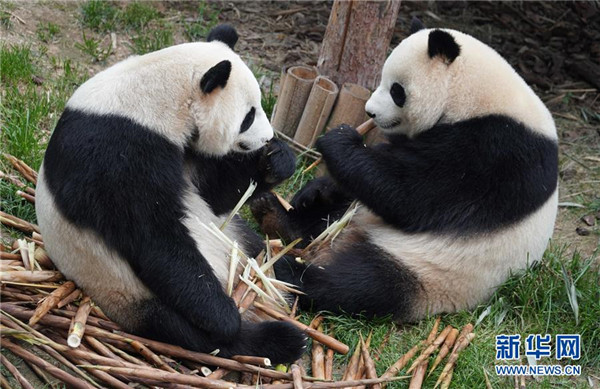 8月16日,大熊貓“奇果”(右)和“園滿”在西寧熊貓館內(nèi)玩耍。青海省西寧熊貓館的四只大熊貓已經(jīng)在西寧生活了一年多,在工作人員的悉心照顧下,已經(jīng)適應(yīng)了青藏高原的氣候,身體各項(xiàng)指標(biāo)正常。新華社記者耿輝凰攝