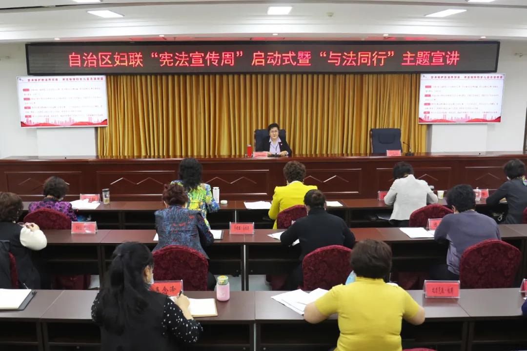 今年12月4日是第七個國家憲法日,也是我國第三個“憲法宣傳周”。今年的活動主題為“深入學(xué)習(xí)宣傳習(xí)近平法治思想,大力弘揚(yáng)憲法精神”。為全面貫徹落實(shí)黨的十九屆五中全會精神和第三次中央新疆工作座談會精神,充分發(fā)揮婦聯(lián)組織的優(yōu)勢和作用,推動憲法學(xué)習(xí)宣傳走入日常生活、走入干部群眾,11月30日, 自治區(qū)婦聯(lián)按照自治區(qū)黨委全面依法治疆委員會辦公室要求,舉辦了“憲法宣傳周”啟動式暨“與法同行”主題宣講活動。