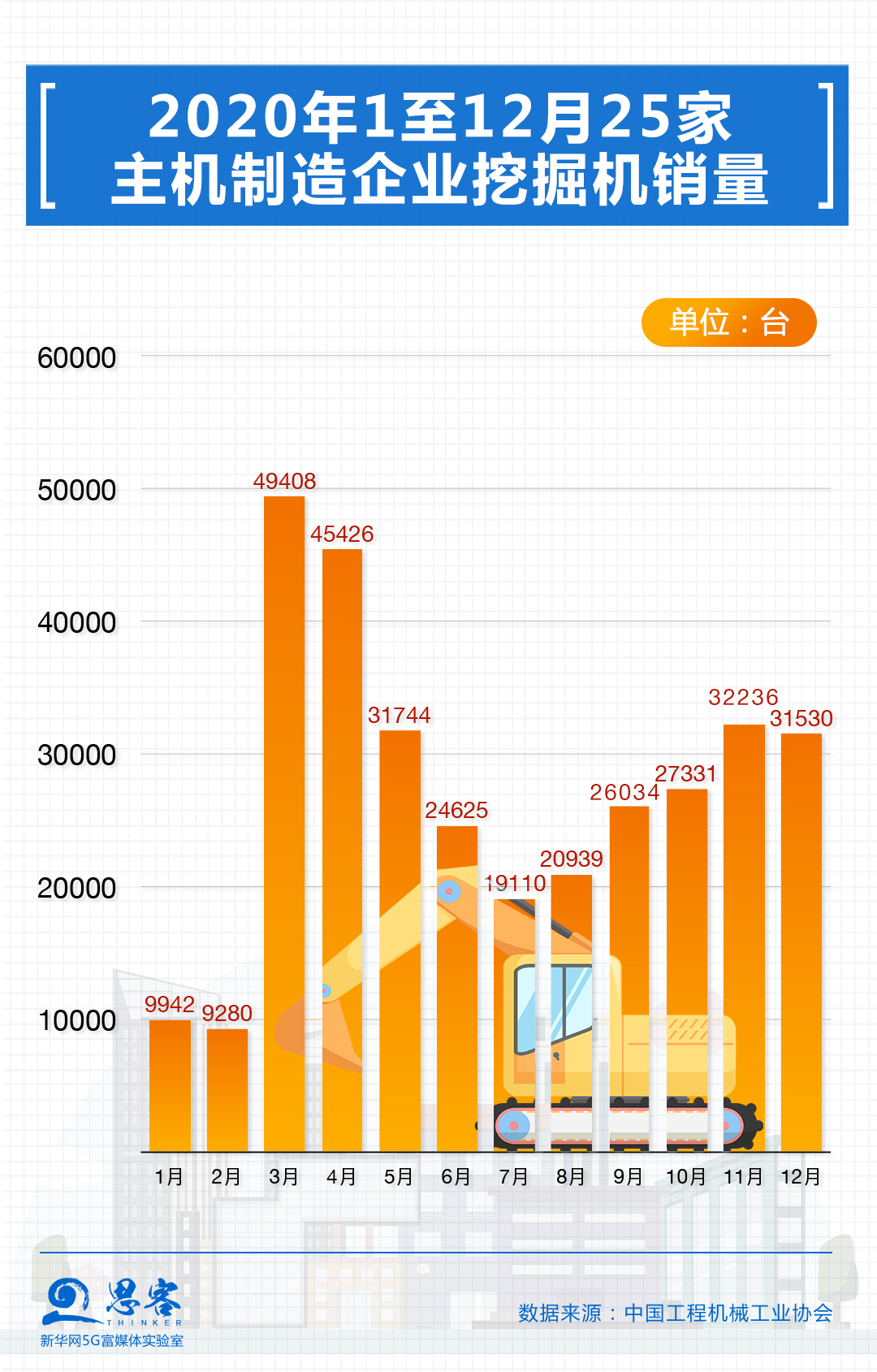 挖掘機(jī)銷量素有中國經(jīng)濟(jì)“溫度計(jì)”之稱。據(jù)中國工程機(jī)械工業(yè)協(xié)會(huì)統(tǒng)計(jì),2020年12月納入統(tǒng)計(jì)的25家挖掘機(jī)制造企業(yè)共銷售各類挖掘機(jī)31530臺(tái),同比增長(zhǎng)56.4%;全年共銷售挖掘機(jī)327605臺(tái),同比增長(zhǎng)39%。從百萬億里程碑和挖掘機(jī)銷量增長(zhǎng)的背后,我們看到了怎樣的中國經(jīng)濟(jì)活力與圖景?