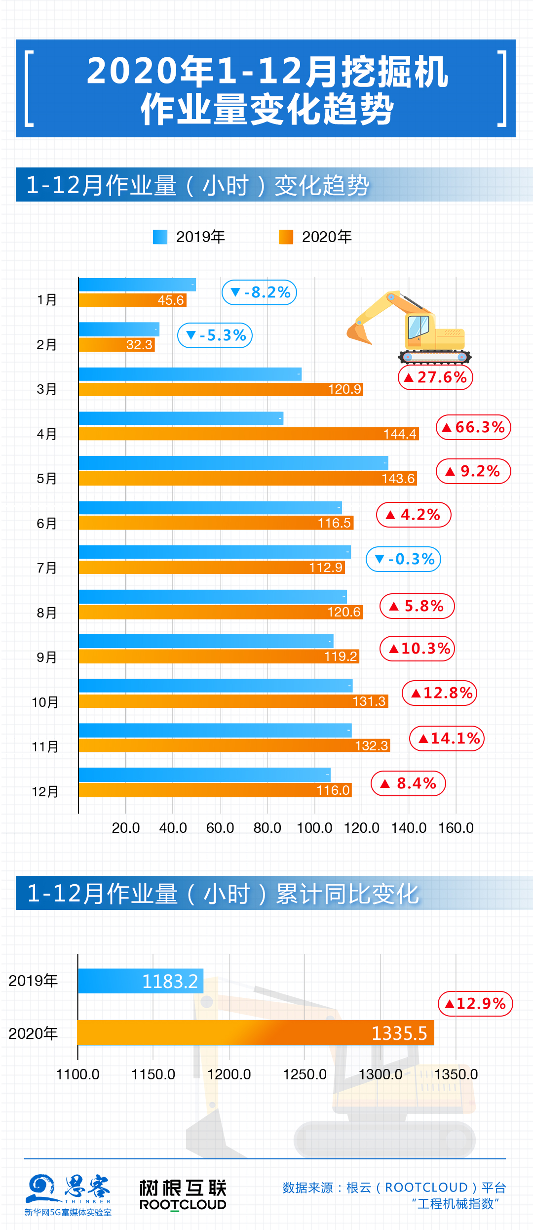 從三一重工孵化的工業(yè)互聯(lián)網(wǎng)平臺(tái)——樹根平臺(tái)的“工程機(jī)械指數(shù)”實(shí)時(shí)數(shù)據(jù)看,2020年全年挖掘機(jī)累計(jì)工作時(shí)間超越去年同期,同比上漲12.9%。與此同時(shí),四季度數(shù)據(jù)尤其令人欣喜,10月、11月、12月三個(gè)月份從銷量到工作時(shí)間,均保持較為高速和平穩(wěn)的增長(zhǎng)。樹根互聯(lián)聯(lián)合創(chuàng)始人、CEO賀東東說,“挖掘機(jī)指數(shù)”不僅反映經(jīng)濟(jì)活力,還清晰展現(xiàn)中國基建的火熱圖景。