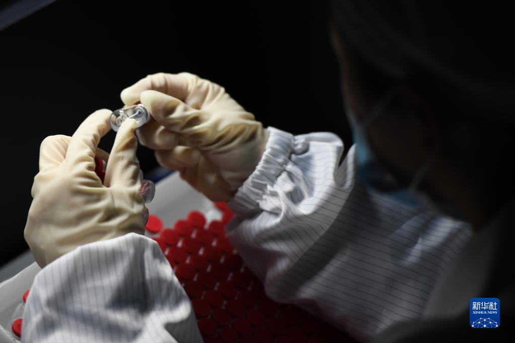 在安徽智飛龍科馬生物制藥有限公司新冠疫苗生產(chǎn)線上,工作人員對疫苗進(jìn)行人工檢測(5月20日攝)。新華社記者 黃博涵 攝