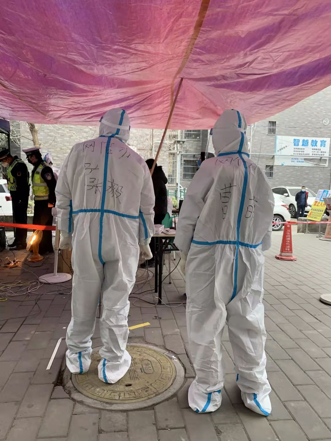 就在隔壁美美佳園小區(qū),張毅、曹萌、胡迪、劉春艷、胡振東、徐晨楊等人也早早鉆進了防護服,從學習到上崗、從開始到投入,絲毫沒有停歇,午餐時間成了唯一交流的機會,在微信群里工作的照片就像是默契的鏡子:“已看不清是誰的臉,卻能彼此知道你是誰。”
