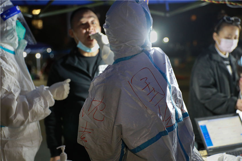 西安國際醫(yī)學(xué)中心醫(yī)護(hù)人員進(jìn)行核酸采樣工作。
