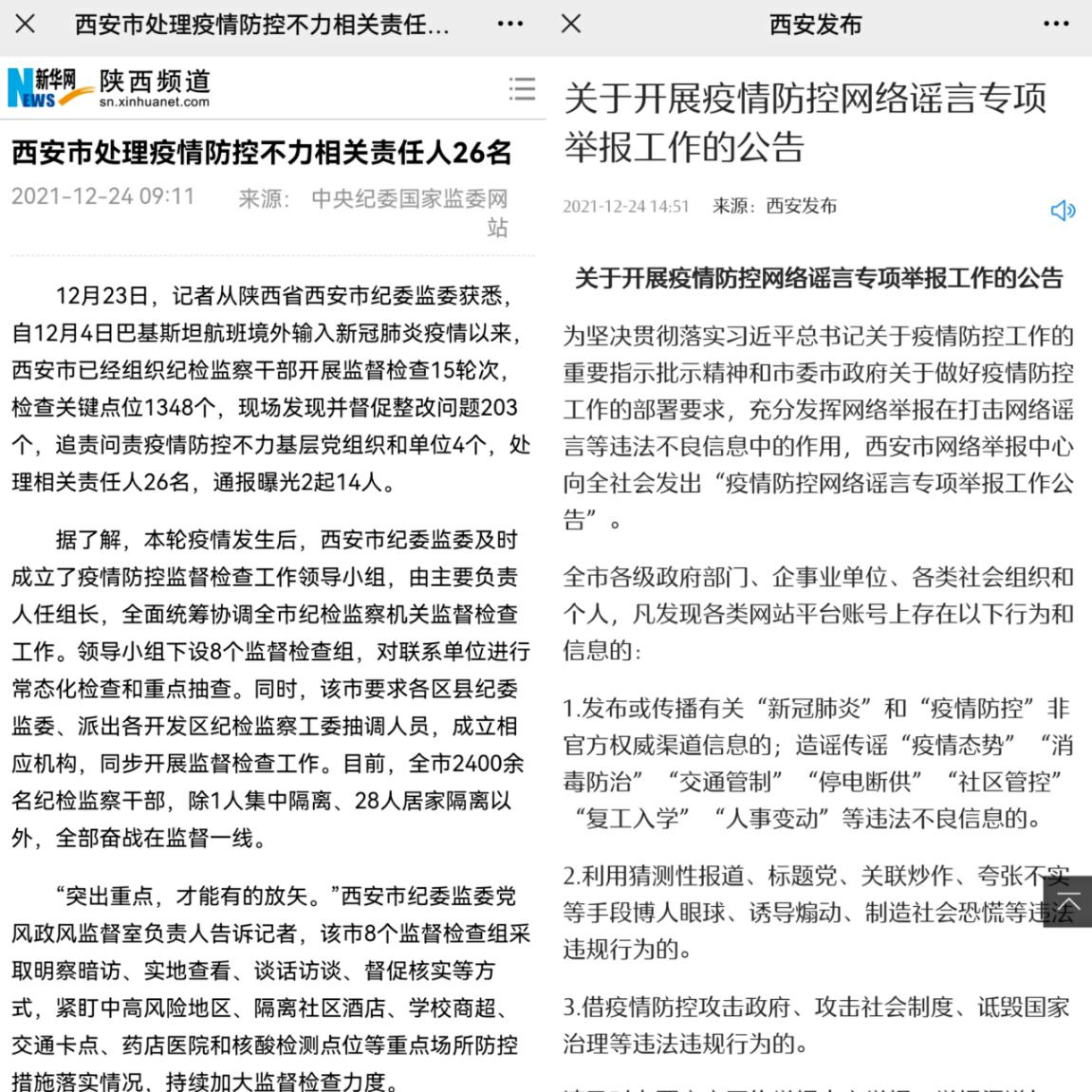 對(duì)在疫情防控工作中不擔(dān)當(dāng)、不作為,推諉扯皮、消極應(yīng)付等形式主義官僚主義問題,西安市嚴(yán)肅查處、精準(zhǔn)問責(zé)、及時(shí)曝光,進(jìn)一步嚴(yán)明疫情防控紀(jì)律,壓緊壓實(shí)各方責(zé)任。目前,西安市已經(jīng)組織紀(jì)檢監(jiān)察干部開展監(jiān)督檢查15輪次,檢查關(guān)鍵點(diǎn)位1348個(gè),現(xiàn)場(chǎng)發(fā)現(xiàn)并督促整改問題203個(gè),追責(zé)問責(zé)疫情防控不力基層黨組織和單位4個(gè),處理相關(guān)責(zé)任人26名,通報(bào)曝光2起14人。