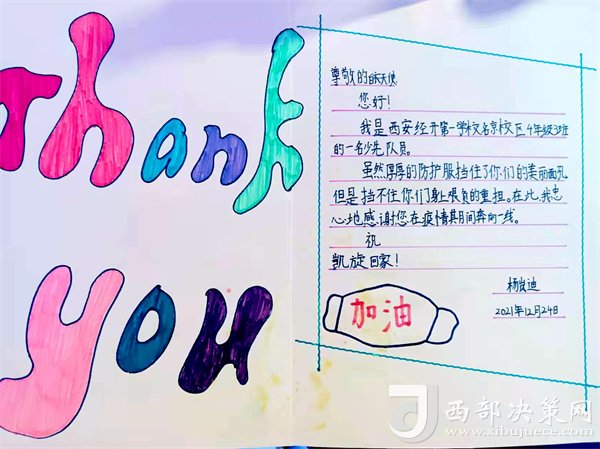 三九嚴冬,雪花紛飛,寒風(fēng)刺骨。12月24日,一大早,我和隊員們早早到指定地點集合,等待分配任務(wù)??吹阶o理姐妹們個個兒都精神飽滿、整裝待發(fā),我的心情是又緊張又激動。當我們到達任務(wù)采集地點時,社區(qū)工作人員和志愿者同志為我們搭建了一個簡易帳篷。帳篷四翼隨風(fēng)飄揚,凜冽的寒風(fēng)襲進帳篷,如同置身風(fēng)口一樣。一切準備就緒,換上防護用品,立即開展工作。室外溫度達零下五度,我們認真地為每位居民采集核酸。采集完核酸后,做到一人一消,隊員的手都凍得通紅麻木,已經(jīng)感覺不到疼痛,面屏上都已經(jīng)霧氣籠罩,但是,隊員們沒有一個人喊累、沒有一個人退縮,更沒有一個人喊停。這時,耳畔傳來一聲,“孩子,辛苦了,這是我給你們送的熱水,” “我家有熱寶,給你們?nèi)∪∨?rdquo;“姐姐,謝謝你們,”說著,一個小女孩走過來,送來兩張自己做的小賀卡,上面寫的都是感謝的話語。