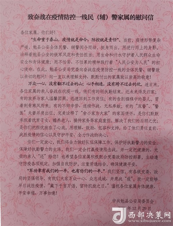 西部決策網(wǎng)訊為表達(dá)對(duì)奮戰(zhàn)在疫情防控一線民輔警家屬的崇高敬意,感謝他們對(duì)公安工作的理解和支持,12月29日下午,勉縣公安局組織開展疫情防控一線民輔警家屬慰問活動(dòng),為家屬們送去慰問信和慰問品,并通過他們向奮戰(zhàn)在一線的民輔警傳遞勉縣公安局黨委的溫暖和關(guān)愛,以更加飽滿的熱情、昂揚(yáng)的斗志投入到疫情防控工作中。