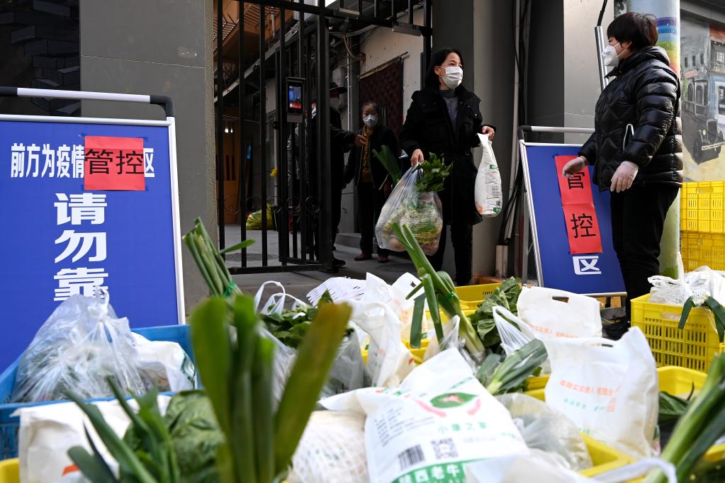 12月29日,在西安市新城區(qū)西一路街道通濟南坊一號院,居民在領取免費生活物資。新華社記者 劉瀟 攝