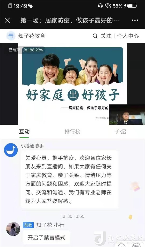 西部決策網(wǎng)訊 面對當(dāng)前嚴峻的疫情防控形勢,為了貫徹落實渭南潼關(guān)縣教科局“停課不停學(xué)”的工作部署,潼關(guān)縣城關(guān)二中全面開展了線上教育教學(xué)活動。為了更好的幫助全校師生及學(xué)生家長保持平和心態(tài),處理好“停課不停學(xué)”中,教師、學(xué)生及學(xué)生家長可能出現(xiàn)的心理問題,進行有效的心理調(diào)試,潼關(guān)縣城關(guān)二中組織全校師生及學(xué)生家長觀看了陜西省教育廳舉辦的《心理健康暨家庭教育》線上直播講座,各位心理專家根據(jù)不同的人群進行了正確有效的心理輔導(dǎo)與科學(xué)的指導(dǎo),為全體師生和學(xué)生家長筑起了抗疫“心”防線。