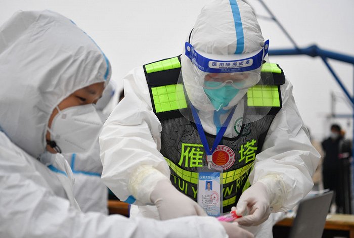 ↑1月7日,西安市雁塔區(qū)退役軍人志愿突擊隊隊員在一處核酸檢測點互相協(xié)助為防護服消毒。