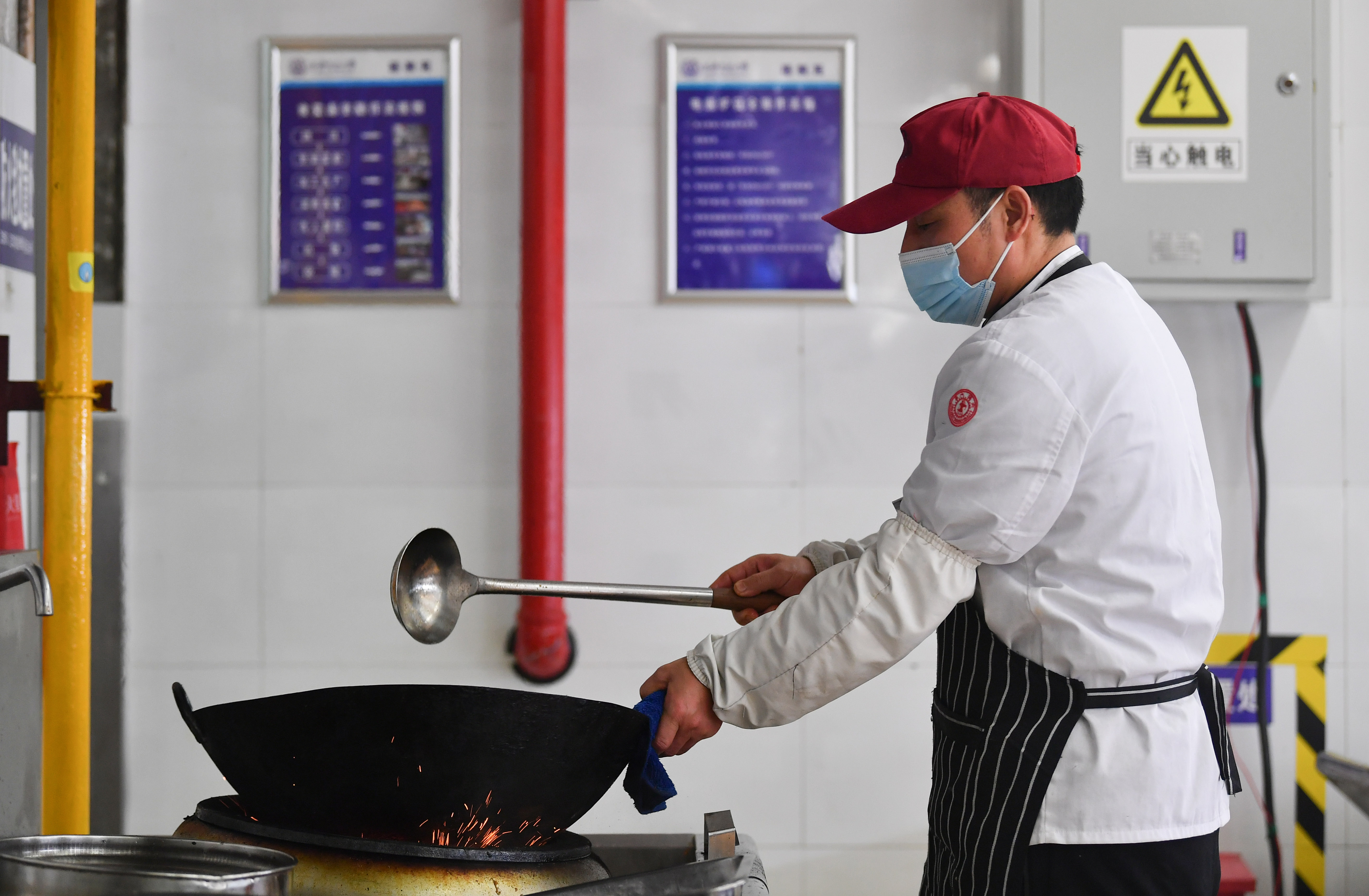1月29日,工作人員在西安交通大學(xué)興慶校區(qū)校園食堂準備午餐。新華社記者 張博文 攝