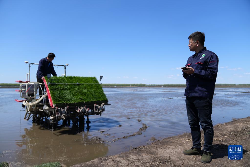 在北大荒集團(tuán)建三江分公司七星農(nóng)場(chǎng)有限公司萬(wàn)畝稻田邊,農(nóng)機(jī)手陸向?qū)нB續(xù)輕觸兩下手機(jī),一臺(tái)帶有北斗導(dǎo)航系統(tǒng)的無(wú)人駕駛插秧機(jī)開(kāi)始作業(yè)。