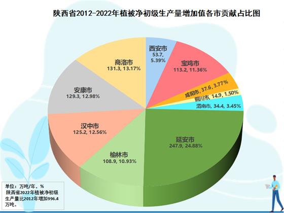 2012-2022年分市元生產(chǎn)量增長(zhǎng)貢獻(xiàn)分析結(jié)果表明,各市對(duì)全省生態(tài)蛋糕增長(zhǎng)均有所貢獻(xiàn),但各市的貢獻(xiàn)大小差異很大,在生態(tài)蛋糕中的地位也隨之有所變化。全國(guó)退耕還林策源地美稱的延安是全省生態(tài)蛋糕增量最大的市,10年增加247.9萬噸,為全省生態(tài)蛋糕增加量貢獻(xiàn)了24.9個(gè)百分點(diǎn)。商洛第二,10年增加131.3萬噸,為全省貢獻(xiàn)13.2個(gè)百分點(diǎn)。安康第三,10年增加129.3萬噸,為全省貢獻(xiàn)13.0個(gè)百分點(diǎn)。漢中第四,增加125.2萬噸,為全省貢獻(xiàn)12.6個(gè)百分點(diǎn)。其后,依次分別是寶雞增加113.2萬噸、為全省貢獻(xiàn)11.4%,榆林增加108.9萬噸、為全省貢獻(xiàn)10.9%,西安增加53.7萬噸、為全省貢獻(xiàn)5.4%,咸陽增加37.6萬噸、為全省貢獻(xiàn)3.8%,渭南增加34.4萬噸、為全省貢獻(xiàn)3.4%,銅川增加24.9萬噸、為全省貢獻(xiàn)1.5%。