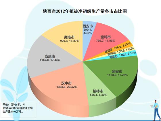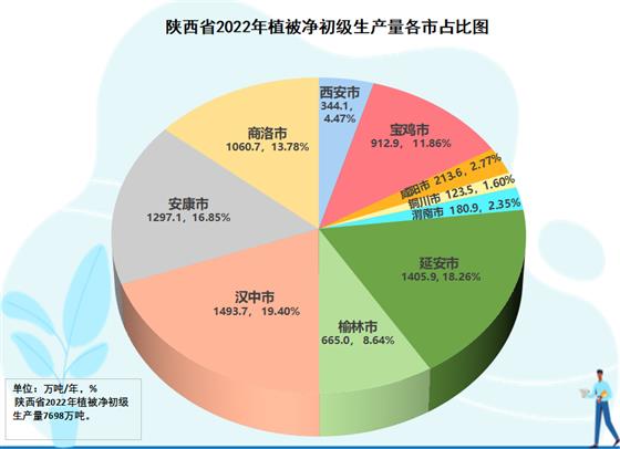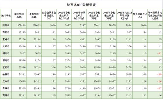 全省元生產(chǎn)力區(qū)域分析結(jié)果表明,在三大區(qū)域生態(tài)蛋糕越來越大的同時(shí),生態(tài)蛋糕的空間布局上與結(jié)構(gòu)發(fā)生變化,呈現(xiàn)黃河流域綠色崛起大趨勢(shì)。陜北榆林、延安兩市,生態(tài)空間8971.6萬畝,占全省的39.6%;關(guān)中西安、寶雞、咸陽、渭南、銅川五市生態(tài)空間4554.5萬畝,占全省的29.2%;陜南漢中、安康、商洛三市生態(tài)空間9136.2萬畝,占全省的40.2%。2022年,陜北兩市提供了2070.9萬噸植被凈初級(jí)生產(chǎn)量,占全省的26.9%,比2012年的1714.1萬噸增加313.8萬噸,增長(zhǎng)18.3%,在全省份額上升了1.3個(gè)百分點(diǎn);關(guān)中五市提供了1775.1萬噸的植被凈初級(jí)生產(chǎn)量,占全省的23.1%,比2012年的1524.3萬噸250.8萬噸,增長(zhǎng)16.4%,在全省份額上升了0.3個(gè)百分點(diǎn);陜南三市提供了3851.5萬噸植被凈初級(jí)生產(chǎn)量,占全省的50.0%,比2012年的3462.7萬噸增加388.8萬噸,增長(zhǎng)11.2%,在全省份額下降了1.6個(gè)百分點(diǎn)。2012-2022年全省新增生態(tài)蛋糕996.4萬噸,陜北兩市貢獻(xiàn)31.5%,關(guān)中五市貢獻(xiàn)29.5%,陜南三市貢獻(xiàn)39.0%。陜北、關(guān)中提供的生態(tài)蛋糕占全省的份額已由2012年的48.4%提高到2022年的50.0%。
