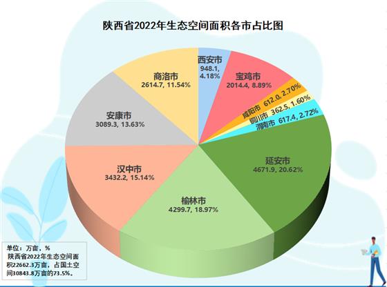 陜西南部秦巴山脈、北部黃土高原、中部渭河川地,自然生態(tài)空間多、占比大。陜西省生態(tài)空間數(shù)據(jù)中心提供的數(shù)據(jù)顯示,全省國(guó)土空間3.08億畝,其中生態(tài)空間(林地、草地、濕地、荒野)2.26億畝。從全省10市生態(tài)空間大格局分析觀察,黃土高原腹地的延安是全省生態(tài)空間第一市,生態(tài)空間4671.9萬畝、占本市國(guó)土空間84.1%、占全省生態(tài)空間20.6%。長(zhǎng)城內(nèi)外、林草過度的榆林居第二,生態(tài)空間4299.7萬畝、占本市國(guó)土空間66.8%、占全省生態(tài)空間19.0%。第三是漢中,生態(tài)空間3432.2萬畝、占本市國(guó)土空間84.4%、占全省生態(tài)空間15.1%。第四是安康,生態(tài)空間3089.3萬畝、占本市國(guó)土空間87.5%、占全省生態(tài)空間13.6%。其后,依次分別是商洛,生態(tài)空間2614.7萬畝、占本市國(guó)土空間90.0%、占全省生態(tài)空間11.5%,寶雞2014.4萬畝、占本市74.1%、占全省8.9%,西安948.1萬畝、占本市62.6%、占全省4.2%,渭南617.4萬畝、占本市31.5%、占全省2.7%,咸陽612萬畝、占本市39.5%、占全省2.7%,銅川362.5萬畝、占本市62.2%、占全省1.6%。