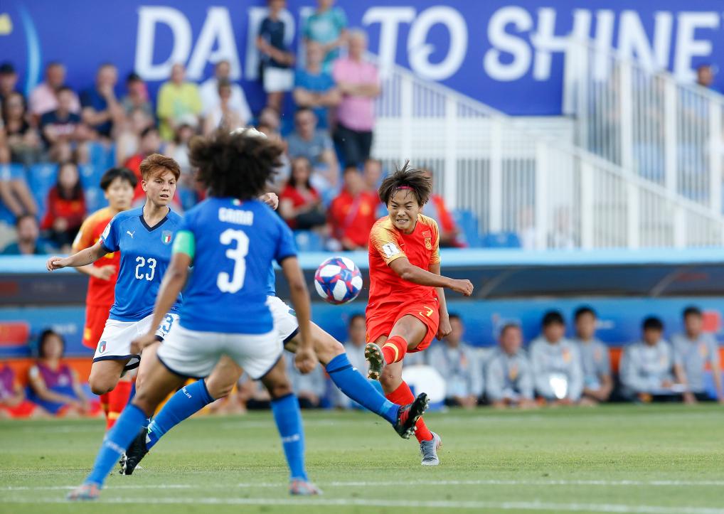 2019年6月25日,中國隊球員王霜(右一)在比賽中射門。當(dāng)日,在法國蒙彼利埃舉行的2019年國際足聯(lián)女足世界杯16強(qiáng)賽比賽中,中國隊以0比2不敵意大利隊,無緣八強(qiáng)。新華社記者丁旭攝
