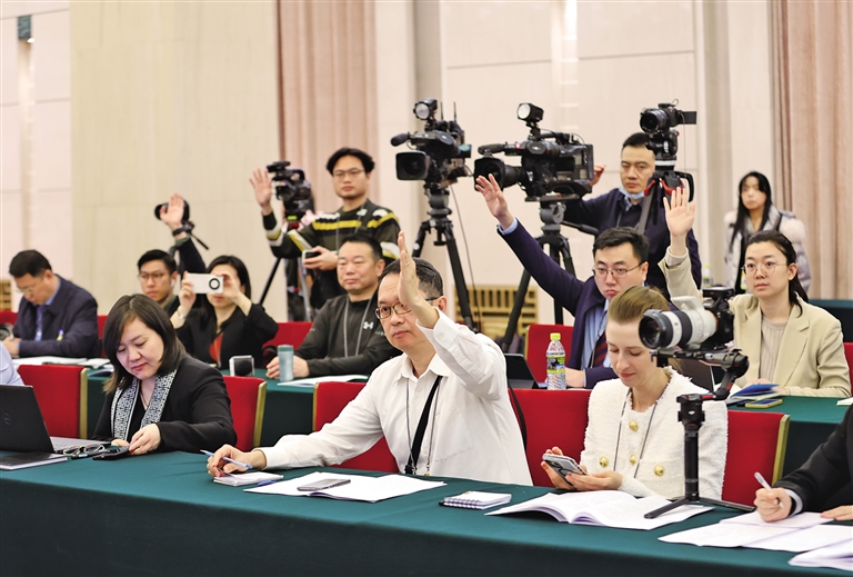 三月六日,中外媒體記者走進(jìn)北京人民大會(huì)堂,參加十四屆全國(guó)人大二次會(huì)議陜西代表團(tuán)媒體開放日活動(dòng)。圖為記者舉手爭(zhēng)取提問機(jī)會(huì)。 記者 母家亮攝